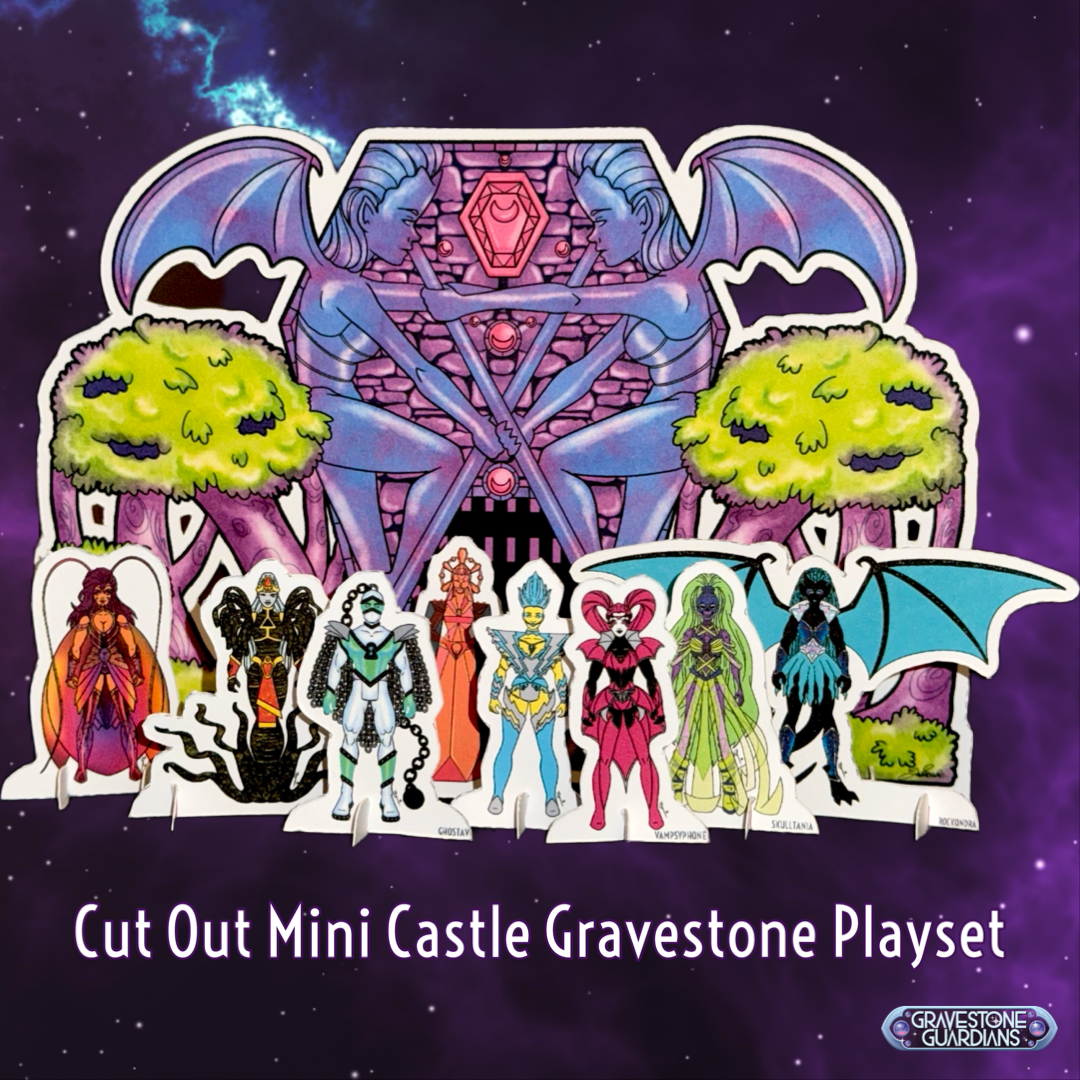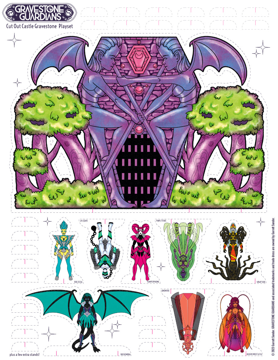 Gravestone Guardians Cut-Out Castle Gravestone Mini Playset Print!! Just cut out along the dotted lines and you're ready to help save the Ghoulverse! Includes Castle Gravestone, the Gravestone Guardians and Evil Queen Infestatia cut-outs!