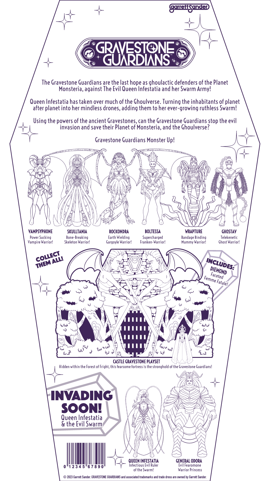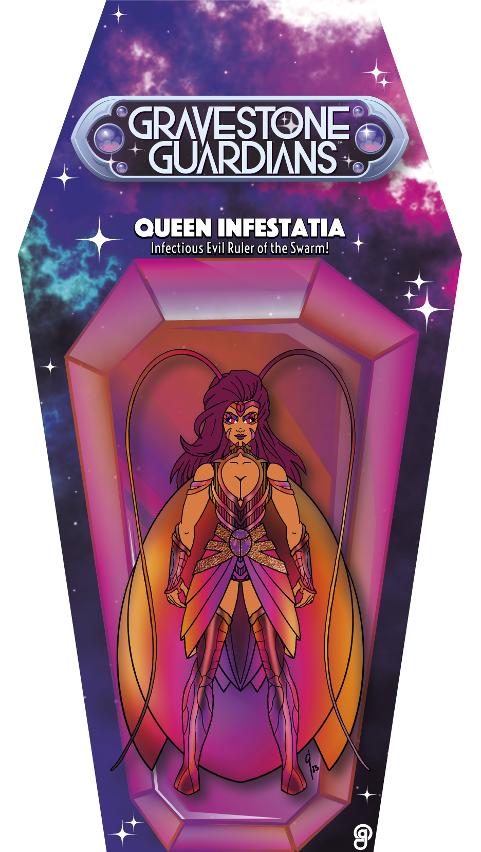 The Gravestone Guardians are the last hope as ghoulactic defenders of the Planet Monsteria, against The Evil Queen Infestatia and her Swarm Army!