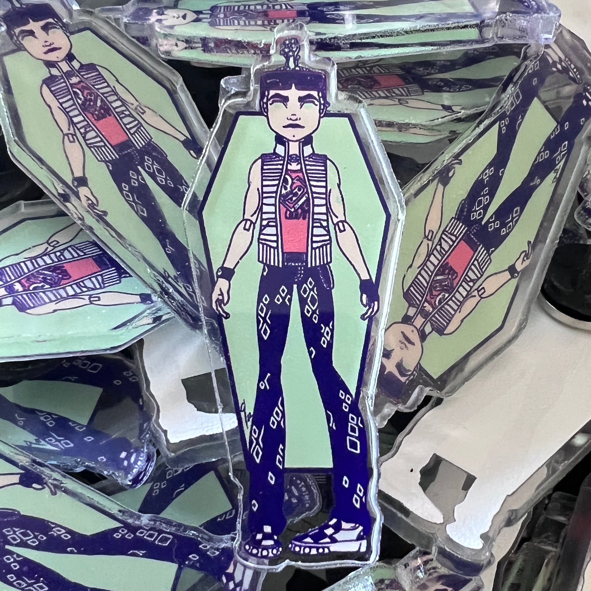 This Acrylic Pin is 2" tall w/ a rubber backer. There is also a clear plastic film to protect the pin during shipping you can peel off on arrival to you.
