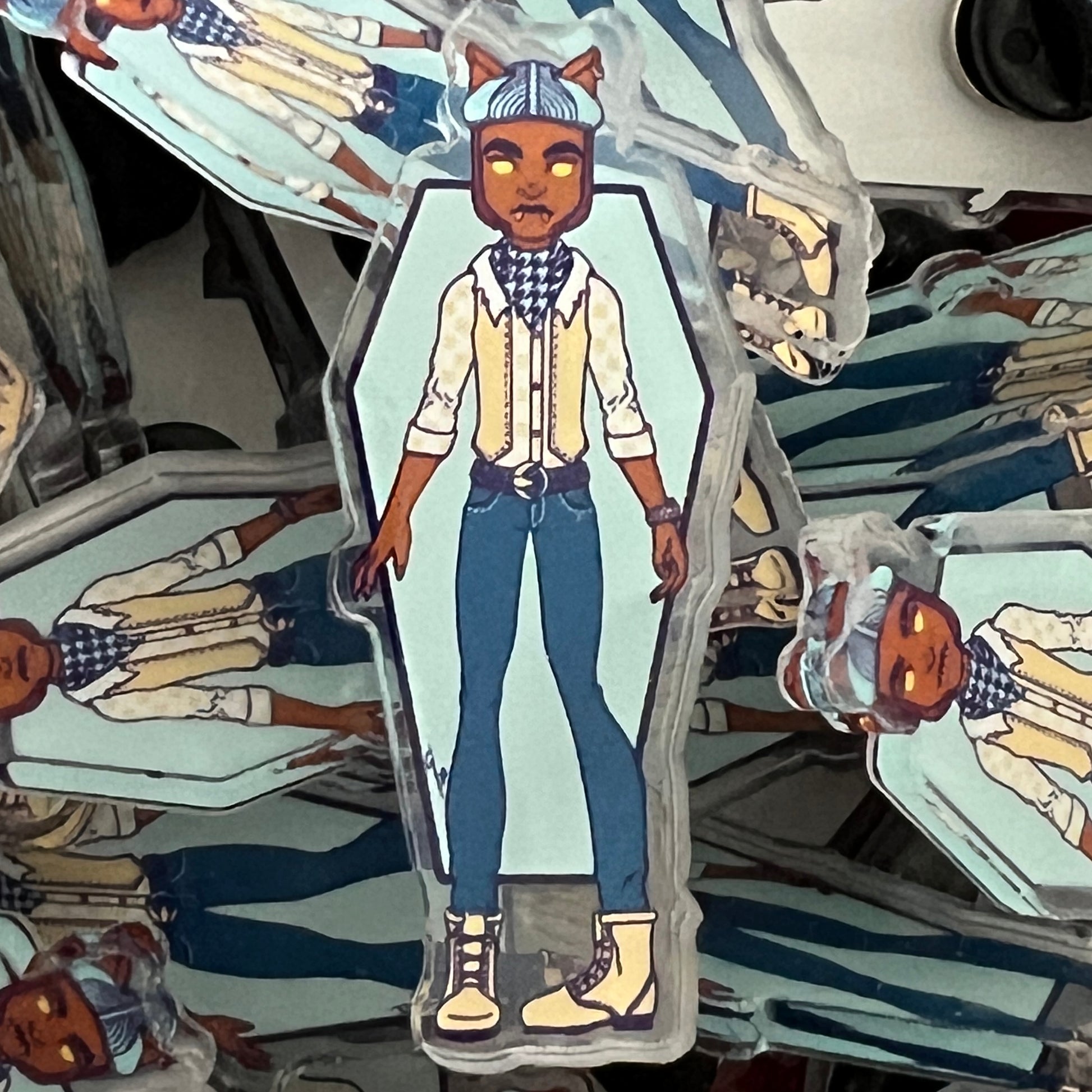This Acrylic Pin is 2" tall w/ a rubber backer. There is also a clear plastic film to protect the pin during shipping you can peel off on arrival to you.