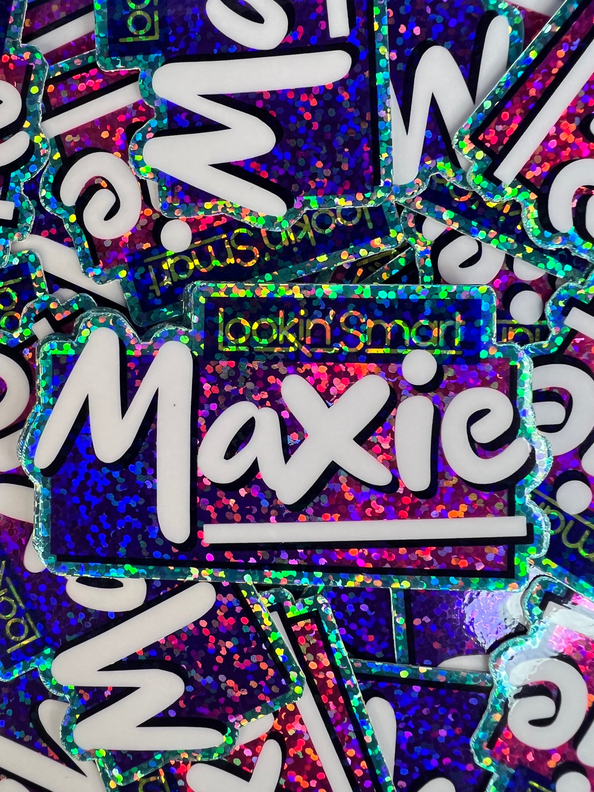 It’s the Lookin’ Smart Maxie logo sticker! This 80s inspired sticker features an updated logo with glitter effect! So rad!