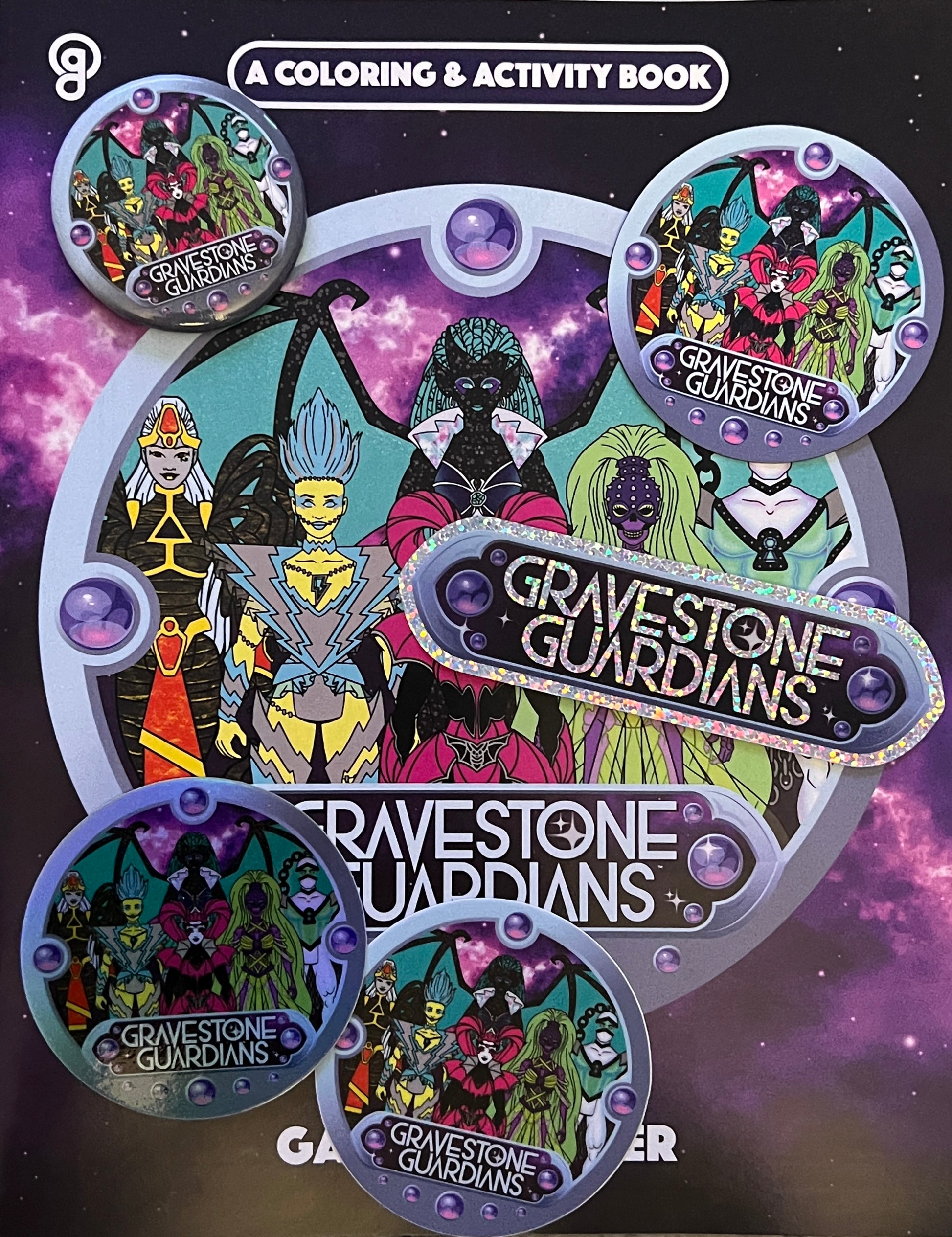 - Gravestone Guardians Coloring & Activity Book! features 10 (front and back) pages filled with characters to color, a word search, and a maze!