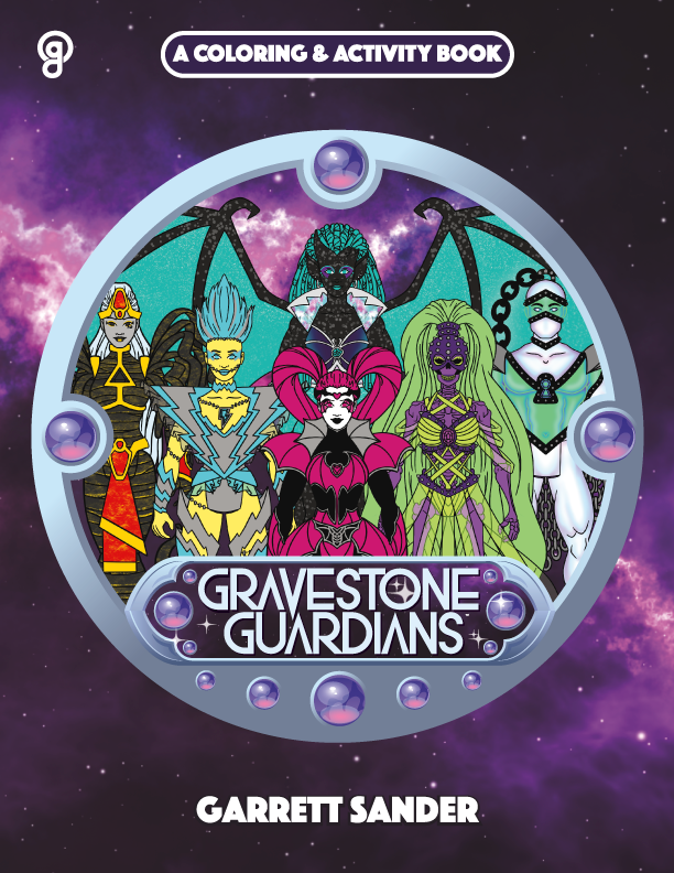Gravestone Guardians Coloring & Activity Book! featuring 10 (front and back) pages filled with characters to color, a word search, and a maze!